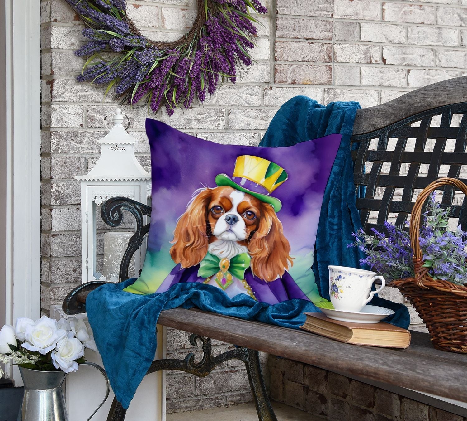 Throw Pillow featuring breed specific Cavalier King Charles Spaniel artwork. Celebrate Mardi Gras with this Mardi Gras Pillow. Revitalize your outdoor or indoor living space with Caroline's Treasures 18x18 Fabric Decorative Pillow. With a generously sized dimension of approximately 18 inches by 18 inches, this pillow makes a comfortable and aesthetic addition to any seating area. Made from a unique, water-resistant material developed by Caroline's Treasures, the pillow sham is 100% polyester fabric that's durable and ready to weather any condition. Its vibrant, full-color artwork will not fade over time as it is dyed with color-fast dyes. Whether you place it on your patio furniture, porch, veranda, or indoor couch, its soft canvas fabric ensures a cozy experience. The pillow is handcrafted in the United States, featuring a sham created from three pieces of fabric and a polyester insert for enduring shape and overstuffed comfort. Despite being robustly built to endure the outdoors, it is as soft and snug as your favorite indoor cushions. Please note, as all our pillows are handmade, sizes may vary slightly, adding to the charm of this unique decorative item.