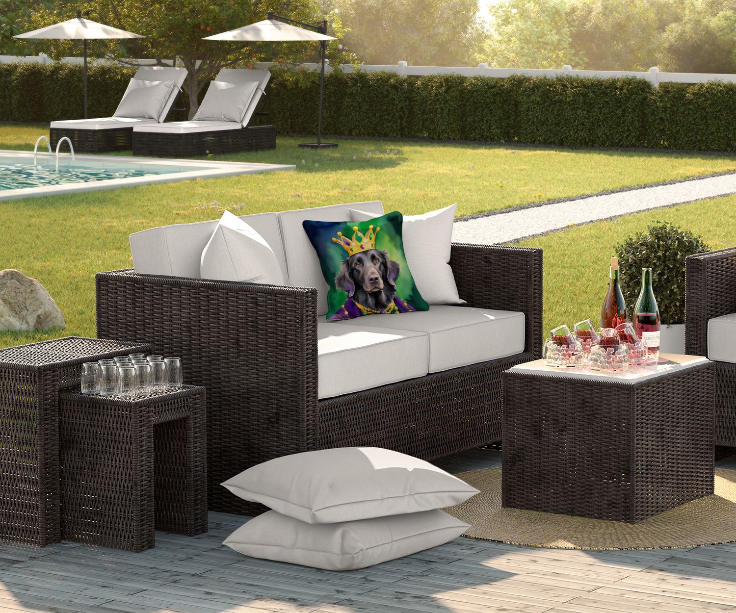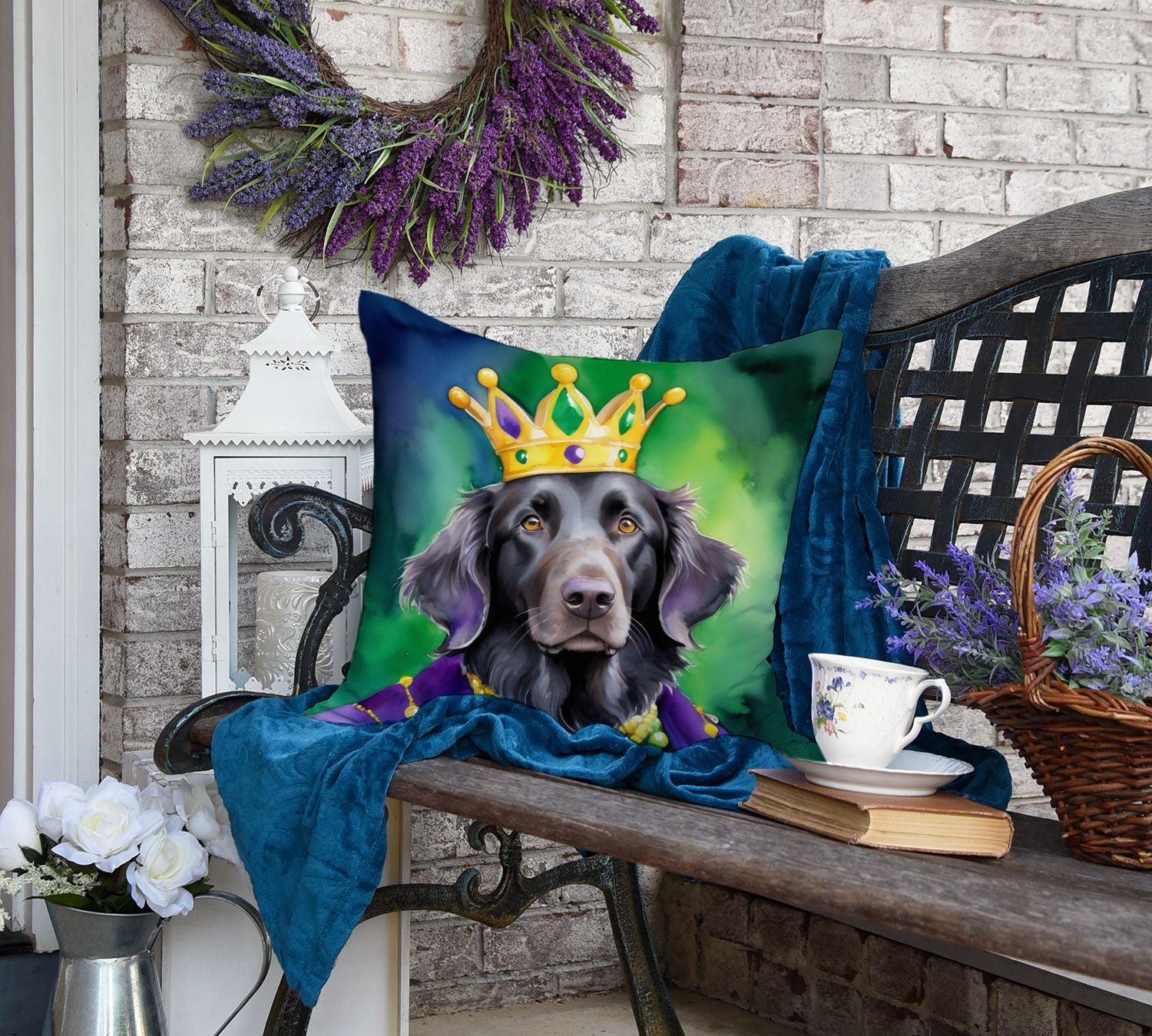Throw Pillow featuring breed specific Flat-Coated Retriever artwork. Celebrate Mardi Gras with this Mardi Gras Pillow. Revitalize your outdoor or indoor living space with Caroline's Treasures 18x18 Fabric Decorative Pillow. With a generously sized dimension of approximately 18 inches by 18 inches, this pillow makes a comfortable and aesthetic addition to any seating area. Made from a unique, water-resistant material developed by Caroline's Treasures, the pillow sham is 100% polyester fabric that's durable and ready to weather any condition. Its vibrant, full-color artwork will not fade over time as it is dyed with color-fast dyes. Whether you place it on your patio furniture, porch, veranda, or indoor couch, its soft canvas fabric ensures a cozy experience. The pillow is handcrafted in the United States, featuring a sham created from three pieces of fabric and a polyester insert for enduring shape and overstuffed comfort. Despite being robustly built to endure the outdoors, it is as soft and snug as your favorite indoor cushions. Please note, as all our pillows are handmade, sizes may vary slightly, adding to the charm of this unique decorative item.
