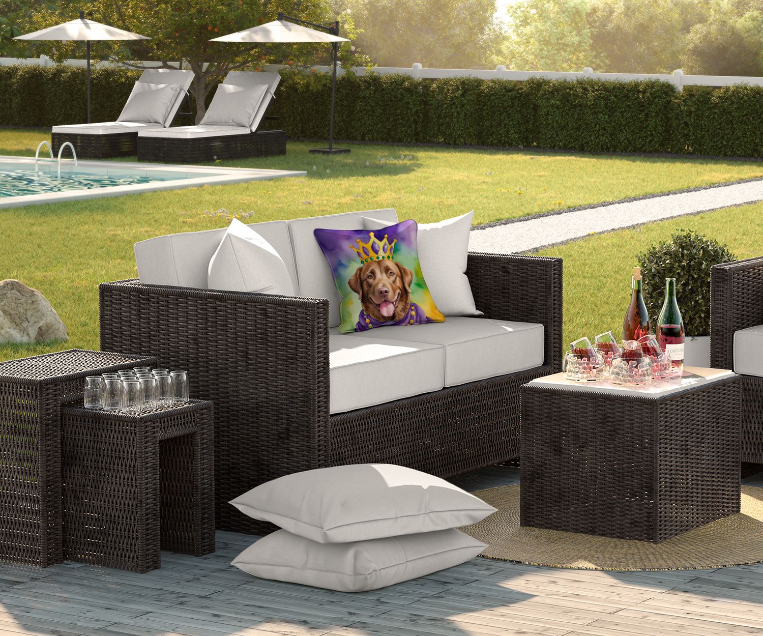 Throw Pillow featuring breed specific Chesapeake Bay Retriever artwork. Celebrate Mardi Gras with this Mardi Gras Pillow. Revitalize your outdoor or indoor living space with Caroline's Treasures 18x18 Fabric Decorative Pillow. With a generously sized dimension of approximately 18 inches by 18 inches, this pillow makes a comfortable and aesthetic addition to any seating area. Made from a unique, water-resistant material developed by Caroline's Treasures, the pillow sham is 100% polyester fabric that's durable and ready to weather any condition. Its vibrant, full-color artwork will not fade over time as it is dyed with color-fast dyes. Whether you place it on your patio furniture, porch, veranda, or indoor couch, its soft canvas fabric ensures a cozy experience. The pillow is handcrafted in the United States, featuring a sham created from three pieces of fabric and a polyester insert for enduring shape and overstuffed comfort. Despite being robustly built to endure the outdoors, it is as soft and snug as your favorite indoor cushions. Please note, as all our pillows are handmade, sizes may vary slightly, adding to the charm of this unique decorative item.