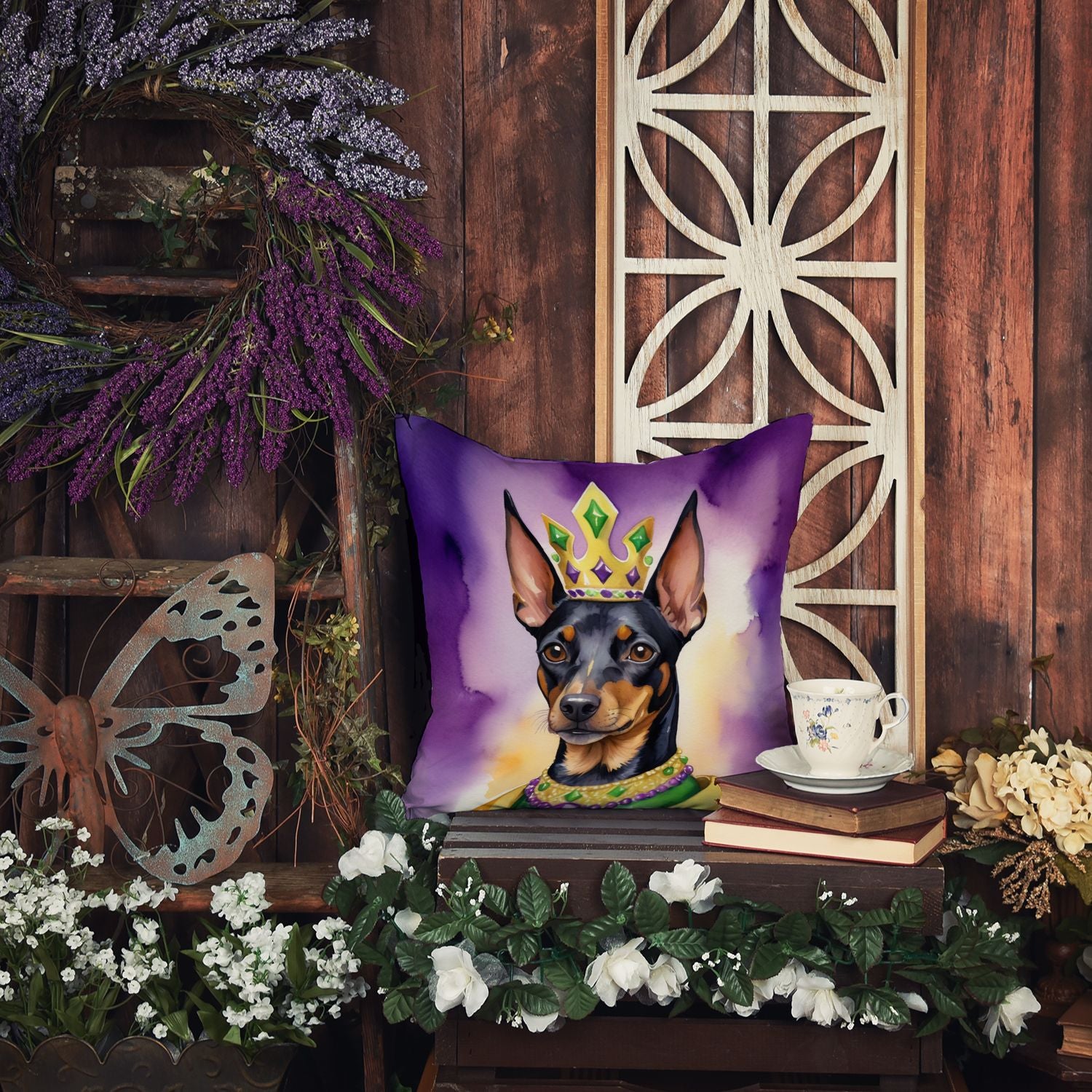 Manchester Terrier King of Mardi Gras Throw Pillow Machine Washable, Indoor Outdoor Decorative Pillow for Couch, Bed or Patio, 14Hx14W