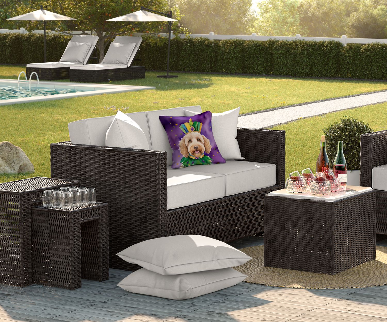 Throw Pillow featuring breed specific Labradoodle artwork. Celebrate Mardi Gras with this Mardi Gras Pillow. Revitalize your outdoor or indoor living space with Caroline's Treasures 18x18 Fabric Decorative Pillow. With a generously sized dimension of approximately 18 inches by 18 inches, this pillow makes a comfortable and aesthetic addition to any seating area. Made from a unique, water-resistant material developed by Caroline's Treasures, the pillow sham is 100% polyester fabric that's durable and ready to weather any condition. Its vibrant, full-color artwork will not fade over time as it is dyed with color-fast dyes. Whether you place it on your patio furniture, porch, veranda, or indoor couch, its soft canvas fabric ensures a cozy experience. The pillow is handcrafted in the United States, featuring a sham created from three pieces of fabric and a polyester insert for enduring shape and overstuffed comfort. Despite being robustly built to endure the outdoors, it is as soft and snug as your favorite indoor cushions. Please note, as all our pillows are handmade, sizes may vary slightly, adding to the charm of this unique decorative item.