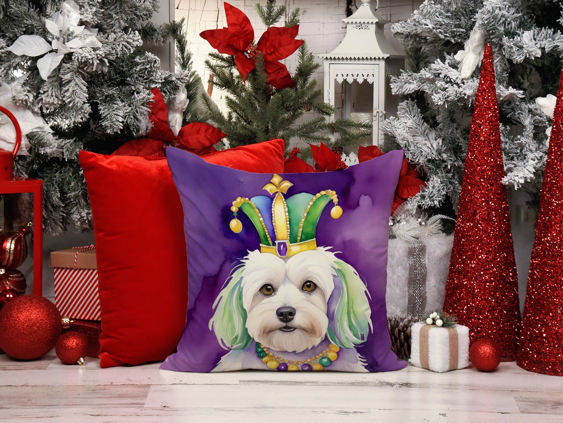 Throw Pillow featuring breed specific Coton de Tulear artwork. Celebrate Mardi Gras with this Mardi Gras Pillow. Add a touch of vibrancy and comfort to your outdoor seating with Caroline's Treasures Fabric Decorative Pillow. Measuring approximately 14 inches by 14 inches, this outdoor pillow is crafted to elevate the appeal of your patio furniture, infusing it with vivid color and artistic flair. The pillow includes a 100% Polyester Fabric sham filled with a quality pillow form to provide superior comfort. Innovatively made from our brand new material, specifically woven for its water resistance, this pillow is designed for durability. The soft canvas fabric offers versatility in use, fit for your indoor couch or your outdoor patio, porch, or veranda. The fabric is dyed with colorfast dyes built for resilience against weather conditions, ensuring the pillow retains its beauty over time. Constructed by sewing three fabric pieces to create a sham, the polyester insert is then nestled inside to form the pillow, resulting in an overstuffed pillow that maintains its shape. Both the sham and the pillow insert are proudly made in the United States. As the pillows are handcrafted, there may be minor variations in size, further enhancing their unique charm. Experience comfort in style with Caroline's Treasures Fabric Decorative Pillow.