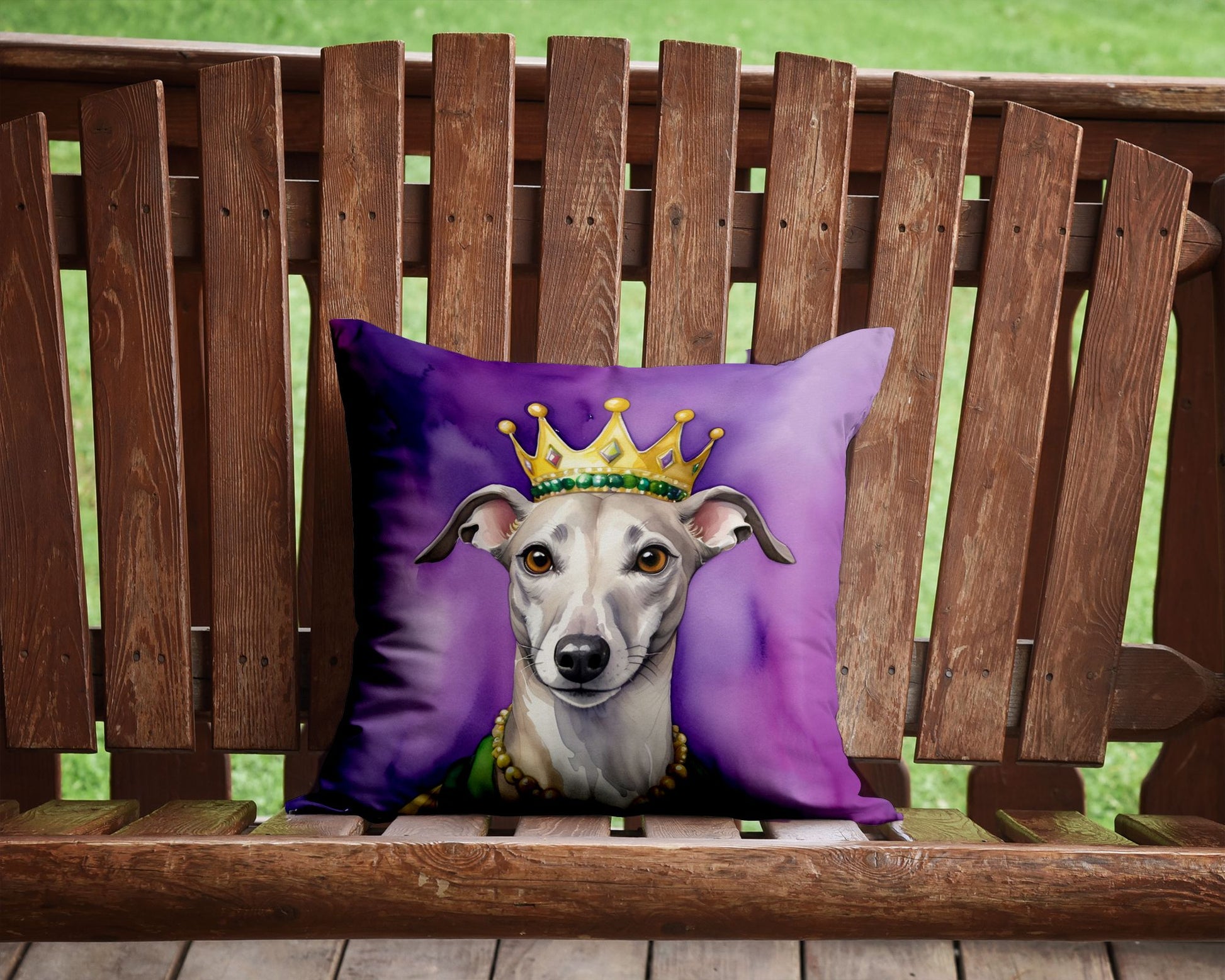 Throw Pillow featuring breed specific Whippet artwork. Celebrate Mardi Gras with this Mardi Gras Pillow. Add a touch of vibrancy and comfort to your outdoor seating with Caroline's Treasures Fabric Decorative Pillow. Measuring approximately 14 inches by 14 inches, this outdoor pillow is crafted to elevate the appeal of your patio furniture, infusing it with vivid color and artistic flair. The pillow includes a 100% Polyester Fabric sham filled with a quality pillow form to provide superior comfort. Innovatively made from our brand new material, specifically woven for its water resistance, this pillow is designed for durability. The soft canvas fabric offers versatility in use, fit for your indoor couch or your outdoor patio, porch, or veranda. The fabric is dyed with colorfast dyes built for resilience against weather conditions, ensuring the pillow retains its beauty over time. Constructed by sewing three fabric pieces to create a sham, the polyester insert is then nestled inside to form the pillow, resulting in an overstuffed pillow that maintains its shape. Both the sham and the pillow insert are proudly made in the United States. As the pillows are handcrafted, there may be minor variations in size, further enhancing their unique charm. Experience comfort in style with Caroline's Treasures Fabric Decorative Pillow.